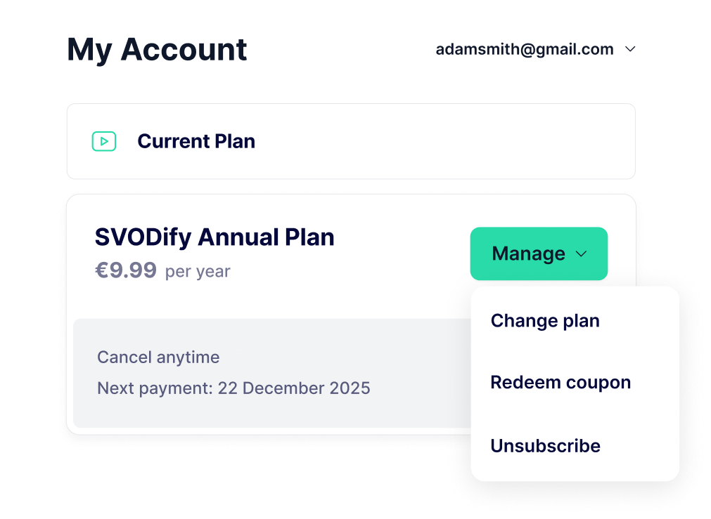 Supports SVOD, PPV, hybrid, tiered, and complex billing, including mid-cycle changes, upgrades, downgrades, and pauses.